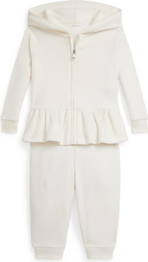 Keep baby ultracozy and coordinated in this matching velour set that pairs a pretty peplum hoodie with joggers.