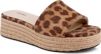 Leopard-patterned suede brings a fierce aesthetic to an espadrille-inspired slide sandal lofted by a jute-wrapped platform and integrated wedge heel. Memory foam cushioning delivers optimal underfoot comfort.