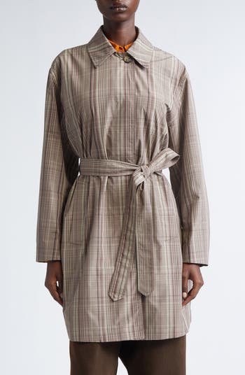 A longline silhouette and plaid in muted hues refresh the classic design of this relaxed coat tethered at the waist by a matching tie belt.