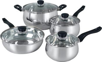 Oster Rametto Stainless Steel 8 pc Cookware Set features convenient larger sizes, belly shaped designed Sauce Pans, Saute Pan and Dutch Oven. Each piece comes with a tempered glass lid that includes a steam vent for overflow protection. Glass lids are great for checking on your food without releasing heat for even and precise cooking. Cookware has black ergonomic bakelite handles and knobs for safe handling, smaller pieces have a convenient hanging hole/utensil holder. Long lasting 0.5mm mirror polished interior and semi polish exterior stainless steel set.