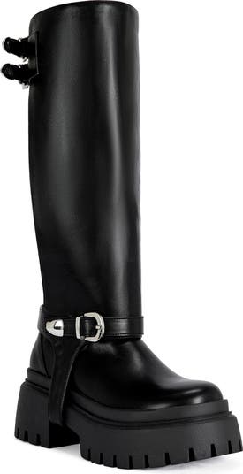 A dramatic cutout detail puts a fresh spin on this knee-high moto boot grounded by a platform-lug sole.