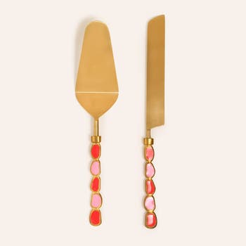 With red and pink handles that wink at you, the Rampur cake serving set arrives not just to serve, but to steal the spotlight. Crafted in India by skilled artisans from durable steel and brass, it stands out with its solid construction, yet draws its true brilliance from its bold character. Born from the heart of the Maximalist collection, this joyful duo turns even the simplest presentation into a colorful show. To preserve its shine, hand washing is recommended.