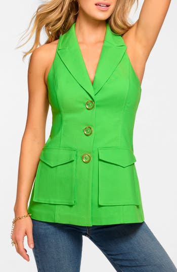 Shapely princess seams and peaked lapels refine the tailored aesthetic of this sleek vest finished with statement buttons and functional pockets.