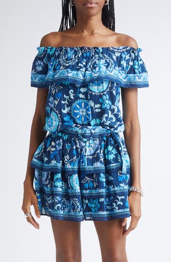 A flouncy ruffled neckline brings fluttering movement to this lively printed top made to show off your shoulders.