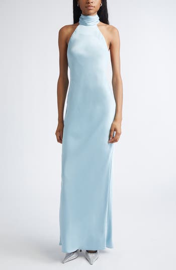 Drink in the slink of a lustrous satin gown designed to catch every curve and show off your shoulders and back.