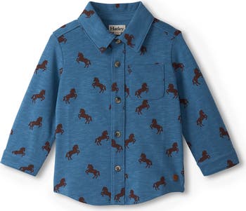 Shadowy horses buck up the charm of a shirt that's sized for your little one and made for comfort from softly slubbed cotton jersey. Front buttons and a pointed collar make for easy on and off and exceptionally cute baby photos.