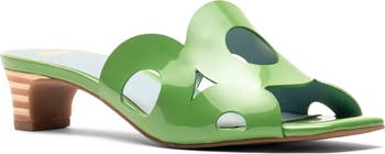 Circular cutouts punctuate a sleek sandal balanced by a square toe and kitten heel.