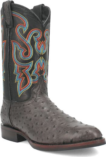 Ostrich-textured leather and colorful embroidery amplify the characteristic cowboy style of a Western boot grounded by a comfort-cushioned footbed.