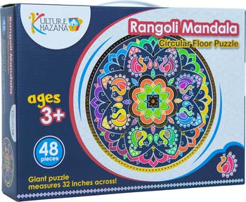 RANGOLI MANDALA CIRCULAR FLOOR PUZZLE The 48-piece Rangoli Mandala Circular Floor Puzzle by Kulture Khazana is HUGE at 32 inches across. The puzzle design depicts South Asian/Indian designs of Rangoli floor art and Mandala. The Mandala design helps relieve stress and increase focus and concentration. A beautiful and uniquely designed floor puzzle. Learn about South Asian culture, celebrate Indian festivals and diversify your playroom with Rangoli Mandala Floor Puzzle. Perfect for Holi, Diwali, Ganesha festival, Navratri, South Asian Wedding, Montessori play and Indian holidays. As a bonus, the back of the box provides a great coloring canvas for experiencing the benefits of mindfulness, creativity, and focus. Kulture Khazana is focused on developing a product line that helps families make heritage and culture accessible and shareable. Kulture Khazana LLC was founded in 2018 with the goal of sharing Indian cultural stories with children through educational and play activities. Today, their collection of affordable and accessible books, toys, games, and online story albums can be found in homes, schools, and libraries around the world. Whether you’re a parent, a library, a media outlet or kids looking to have fun, building community starts with the treasures of home, and we’re here to help bring them to you.