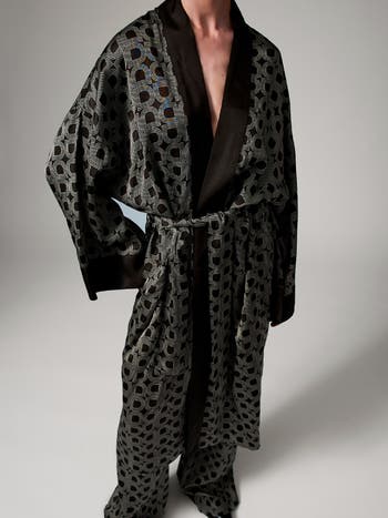 A flowing maxi drape robe that skims the body, geometric patterning and fluid drape create cinematic evening presence, whisper-soft texture and relaxed yet striking silhouette.