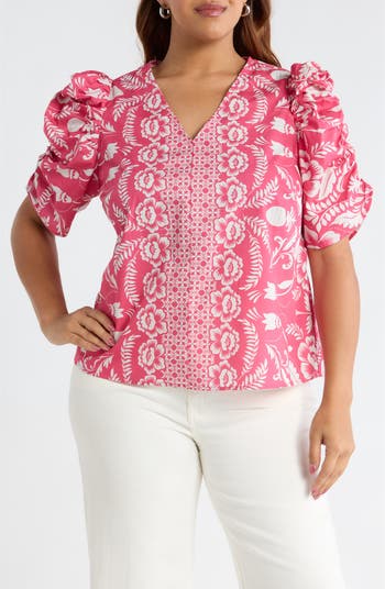 Ruched sleeves bring texture to this V-neck top covered in a vibrant floral print and cut from airy cotton poplin.