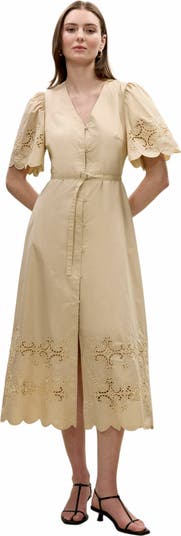 This dress emanates timeless sophistication in rich olive, where intricate matte cotton embroidery and delicate cutouts create an artisanal masterpiece. The midi-length design features refined cotton-covered buttons and pure cotton construction throughout, with each detail thoughtfully crafted to celebrate both elegance and artistry.