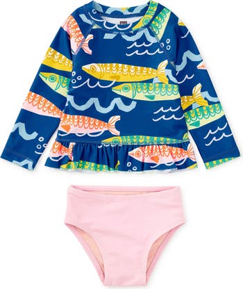 Made for first splashes, sunny pool days, and easy outfit changes, this two-piece baby swim set combines thoughtful coverage with sweet, playful style. The long-sleeve rash guard features a fitted silhouette with raglan sleeves and a lined front bodice, offering UPF 50+ sun protection to help cut down on sunscreen during busy water days. The matching bottoms are fully lined with a soft ruffle waist for a comfortable, stay-put fit that still feels special. Crafted from recycled materials and finished with an artist-designed print created in-house, this set is built to last splash after splash. A perfect choice for baby's early swim moments--and an easy match-back option for coordinated family swim days.