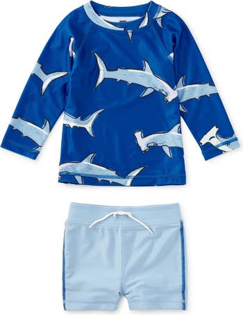Designed for sunny splash days and easy changes, this two-piece swim set offers built-in UPF 50+ sun protection in a soft, stretchy recycled fabric. The fitted rash guard features long raglan sleeves and a lined front bodice for comfortable coverage, while the coordinating swim shorts are fully lined with a gentle elastic waist and decorative ties for a secure, stay-put fit.Finished with a playful allover print, this set is made to mix and match with coordinating family styles, perfect for first beach days, poolside photos, and passing down when the season's done.