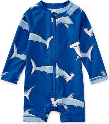 Made for worry-free water days, this one-piece rash guard swimsuit offers built-in UPF 50+ sun protection and thoughtful details parents appreciate. The fitted silhouette features long raglan sleeves, a lined front panel and gusset for comfort, plus a zipper with an interior guard and zipper garage to protect delicate skin. Snaps at the inseam make diaper changes quick and easy--no full outfit removal required. Finished with a playful allover print and crafted from soft, stretchy recycled fabric, it's a sweet, practical choice for baby's first swims and an easy match with coordinating family styles.