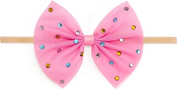 - Features: Raspberry pink tulle bow with multicolor rhinestone accents