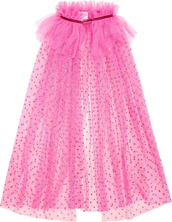 Let her imagination take flight in this dazzling raspberry cape, featuring layers of airy tulle and a magical dusting of multi-colored rhinestones.