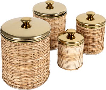 - Set of 4 rattan wrapped stainless steel canisters in a brass finish
