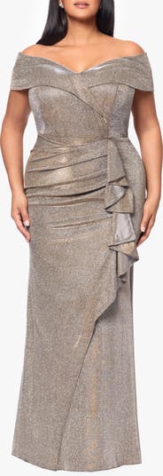 Raveena Foil Knit Off the Shoulder Ruched Gown