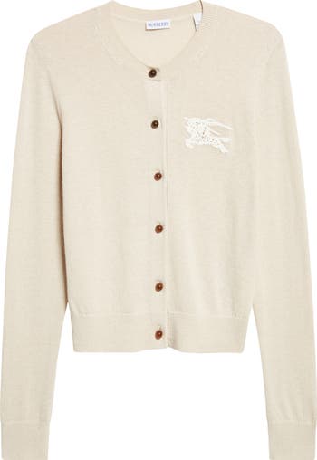Burberry's iconic Equestrian Knight Design rides throughout this season's styles, pausing to pose in a crocheted portrait on this woolly, cotton-rich cardigan refined with a neat row of marbled buttons.