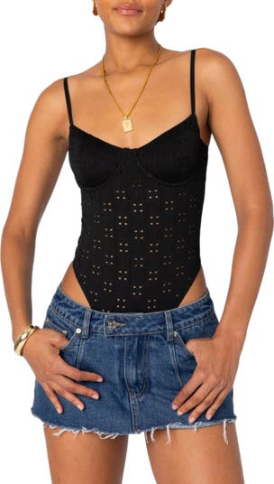 Eyelet embroidery adds airy charm to this thong-cut bodysuit designed with underwire cups that give it a lingerie-inspired look.