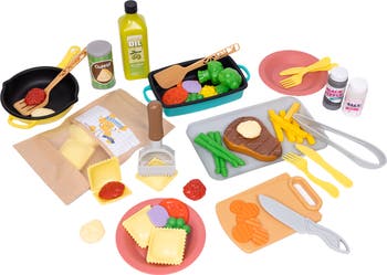 - 50-PIECE SET: Includes steak, vegetables, salt & pepper, ravioli pieces, fillings, sauce cans, cutting tool, plates, forks, knives, oil bottle, and other accessories. Perfect for creating a variety of pretend Italian dishes.