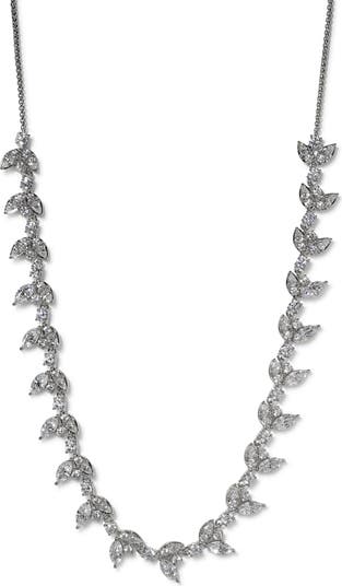 Tiny cubic zirconia leaves decorate the front of an elegant chain necklace with a hand-polished rhodium or 18-karat gold plate.