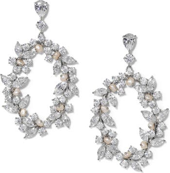 Cubic zirconia and cultured pearls bring eye-catching glamour to vine-inspired drop earrings with a circular silhouette plated in high-shine, hand-polished rhodium.