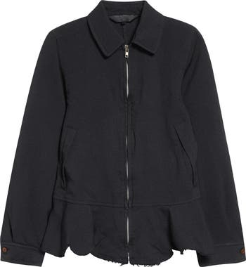 In true CDG tradition, Rei Kawakubo teams sweet and subversive to memorable effect in this slim-cut gabardine jacket flounced with a raw-edged peplum.
