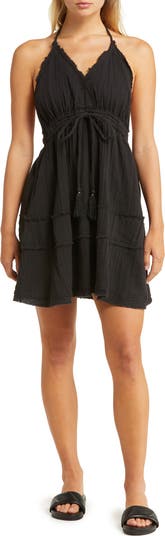 Gauzy cotton lends sunshine-ready style to a tiered dress crafted with a halter neckline and raw finishes for lived-in appeal.