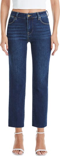 A versatile wash brings faded appeal to a pair of mid-rise jeans finished with raw, slightly cropped hems.