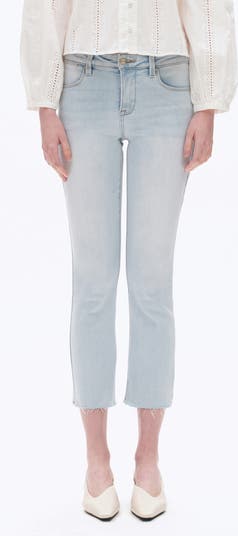 A versatile wash brings faded appeal to a pair of mid-rise jeans finished with raw, slightly cropped hems.