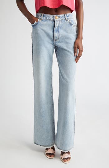 These straight-leg jeans are cut from faded, nonstretch denim with frayed accents and feature an embellished perfume-bottle appliqué on the back pocket. This is a clever nod to the recently launched Les Éternels throwback heritage Balmain fragrance range. A golden 'Double Chain Lion' button and vintage-inspired label add signature touches to the laid-back style.