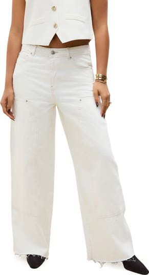 Made from nonstretch denim that softens with wear, these vintage-vibe carpenter jeans have wide legs, knee panels and floor-grazing raw hems.