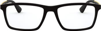 Accessorize in bold, modern style with these angular optical frames featuring gleaming golden accents and logo-etched temples.