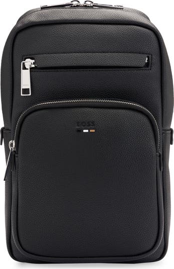Debossed logo detailing and tricolor metal plates bring signature appeal to a textured faux-leather sling bag fitted with multiple compartments and an adjustable strap for on-the-go convenience.