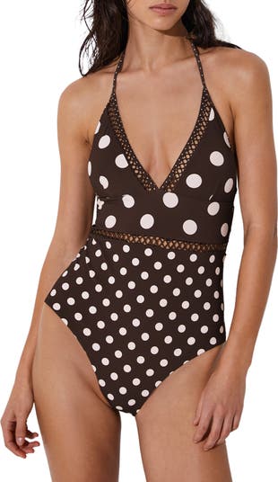 Embroidered insets trim this polka-dot swimsuit made in a one-piece silhouette with a cutout back.