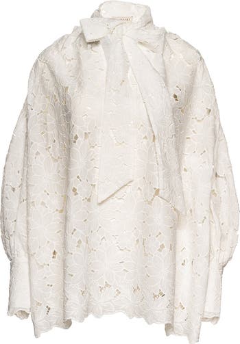 Meet the Raya Lace Top your new summer crush. Made from dreamy white floral lace with peekaboo cutouts and intricate embroidery, this top is all about easy elegance with a fun, flirty twist. The voluminous sleeves bring the drama (in the best way), and the soft tie-neck adds just the right touch of vintage charm.