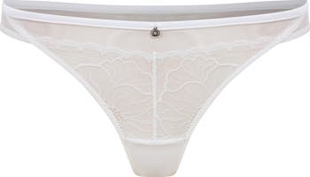 The Raye Thong features sheer tulle along the front waist and delicate lace that flows down toward the gusset. A signature gold-plated House of Silk charm at the center front completes the design with a refined touch. Pair it with the Raye Bra for a striking set.