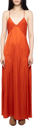 A strappy back and smocked bodice add sass and sweetness to a matte satin dress cut from a feel-good fabric.