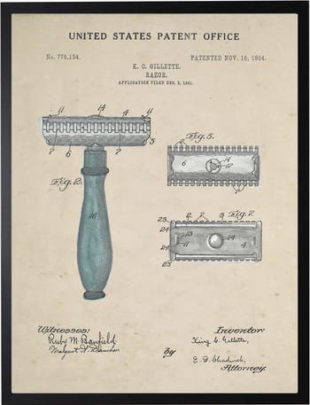 This vintage-inspired print, framed in a black wooden frame, features a razor patent. Sized at 16 inches by 20 inches, this made in the USA frame makes for a beautiful addition to any wall.