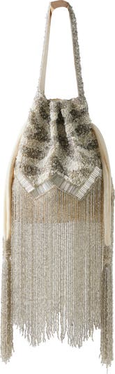 Lustrous beads and swingy fringe bring glamour and opulence to a bucket-inspired clutch that will instantly elevate your look during your next evening out.