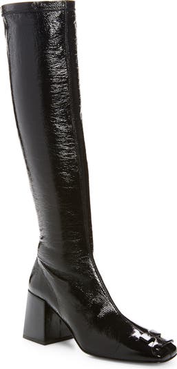 Nicolas Di Felice remixes the label's fundamental space-age futurism in this re-edit of the house's 1971 vinyl boot designed with a sculptural monogram branding the square toe. A robust block heel ups the unmistakable impact of this towering style.