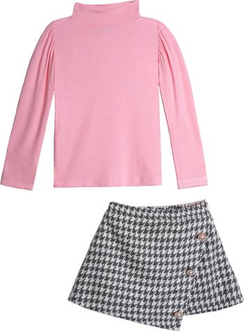 • Long-sleeve pink turtleneck rib knit top and houndstooth skort