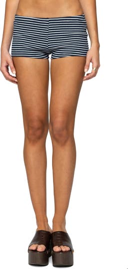 A low-rise waist creates a cozy fit in these stretchy, striped cotton shorts that are perfect for lounging.