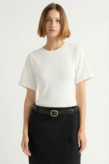 Our version of the elevated everyday tee, with a sculpted silhouette and ribbed details for an elegant shape. We love to style with denim for an effortless update to the classic duo.