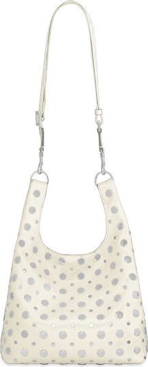 Lustrous studs punctuate the faux-leather exterior and create an edgy aesthetic on a slouchy shopper bag designed with a spacious interior and an optional webbing strap that converts for versatile wear.