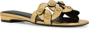 Polished studs embellish the chain-shaped strap of a metallic slide sandal set on a lightly cushioned footbed.