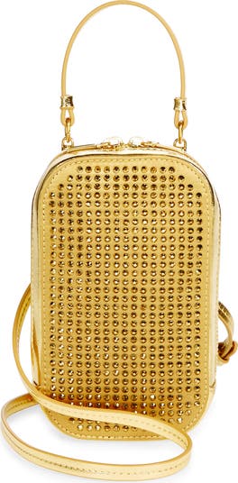 Carry your phone and essential cards in this golden-hued crossbody bag illuminated with sparkling crystals and furnished with a pair of removable straps.