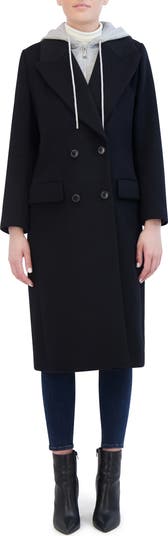 Two effortless looks in one, this double-breasted coat comes complete with a jersey hooded bib that creates a downtown layered look without the bulk.
